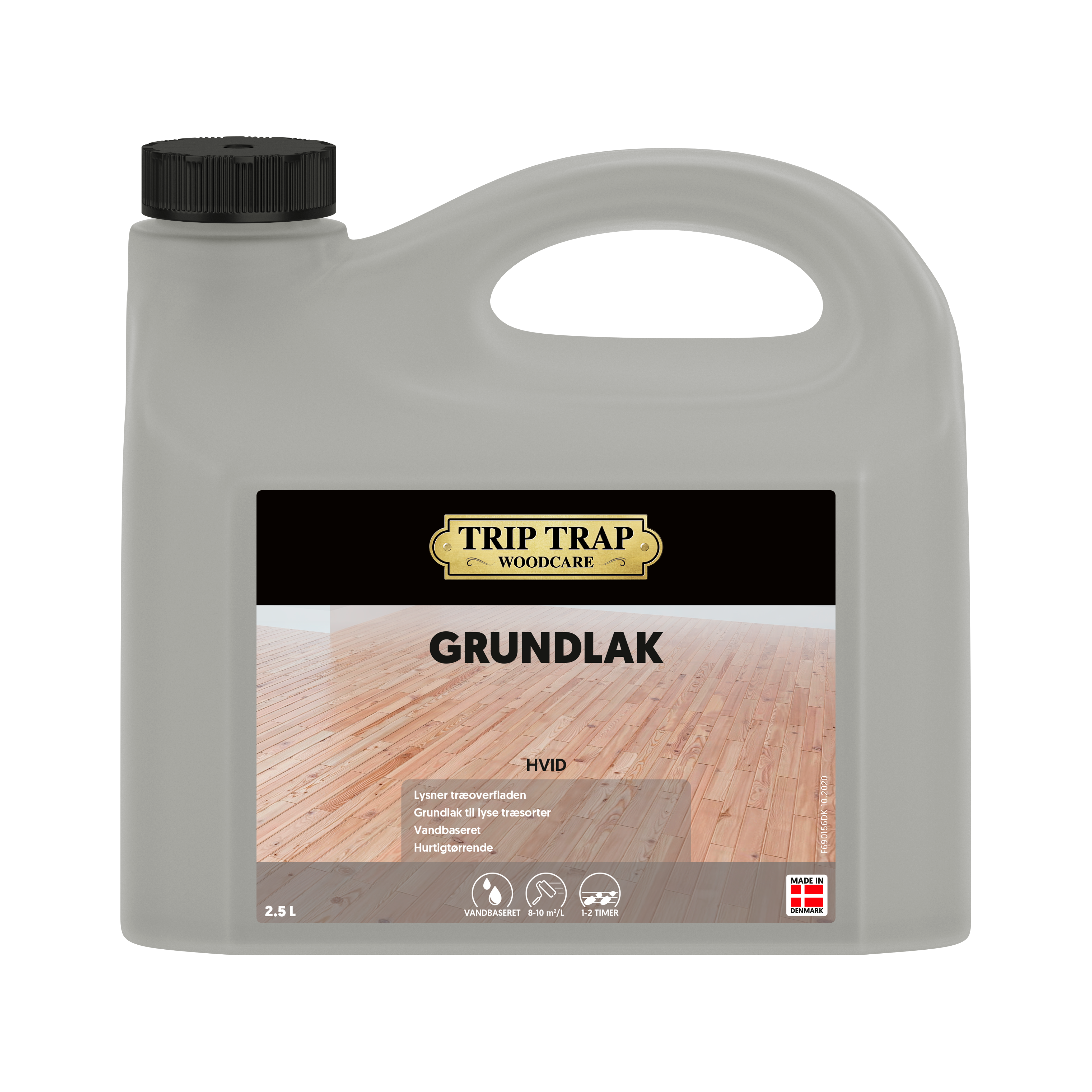 Trip Trap Grundlak, Hvid er en fyldig, vandbaseret, hurtigtørrende og meget slibbar trægrunder til nye eller ny afslebne lyse træsorter. Kan anvendes indendørs på ask, eg, bøg, fyr og gran. Den hvide primer forsegler og lysner træet og minimerer optræk af garvesyre. Grundlak, Hvid fungerer som en stærk grunder før behandling med andre vandige Trip Trap gulvlakker.
