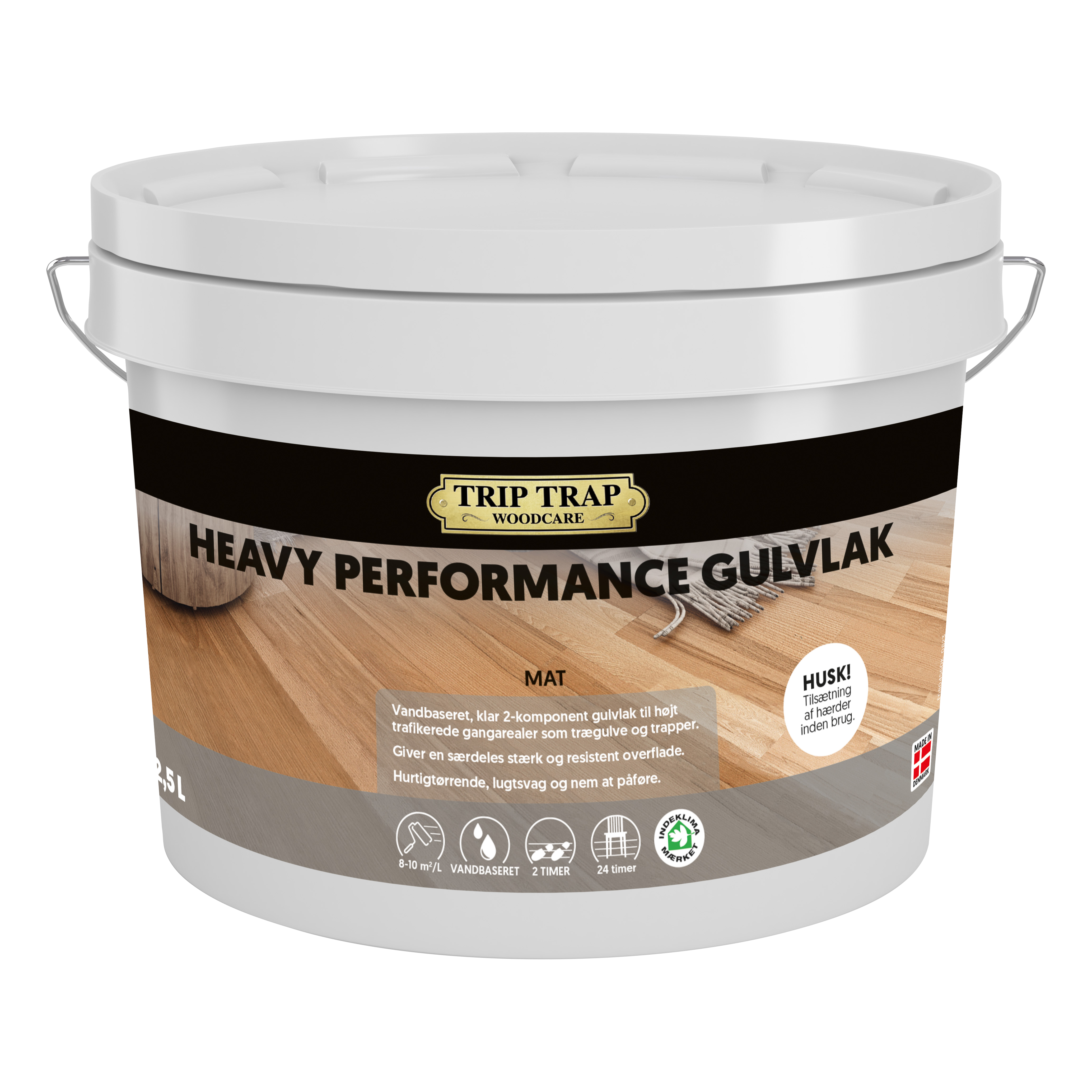 Heavy Performance er en vandbaseret, farveløs og 2-komponent gulvlak. Den er baseret på et specielt polyuretan bindemiddel, som giver en ikke-gulnende, meget slidstærk samt vand- og kemikalieresistent overflade. Lakken giver overfladen en glans 10 og er velegnet til trægulve med middel til høj belastning, som f.eks. trapper, gangarealer i private hjem samt butiks- og kontorområder. Trip Trap Heavy Performance Hærder, som skal tilsættes lakken, er en isocyanatfri og meget effektiv hærder, som er med til at give lakken alle de stærke egenskaber.