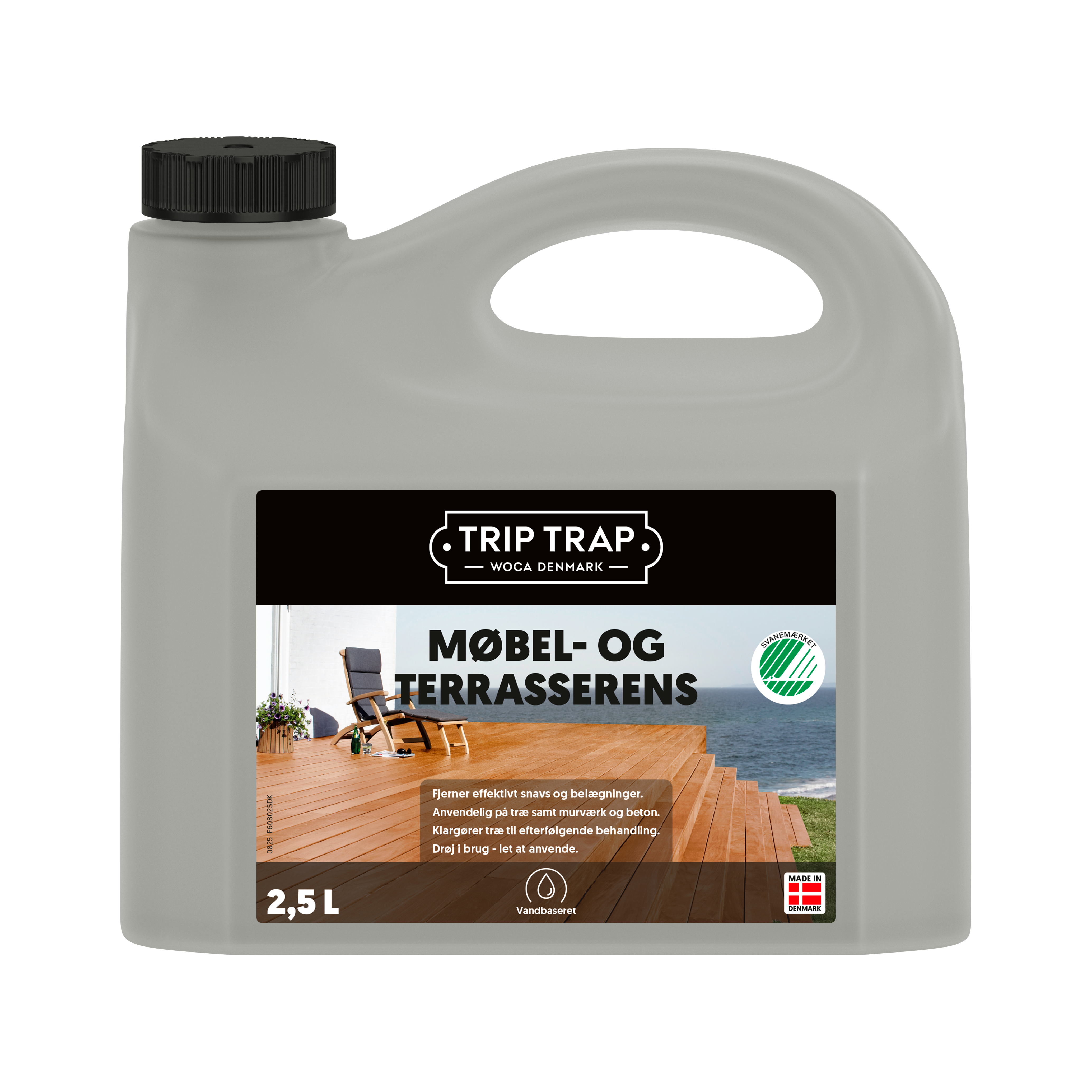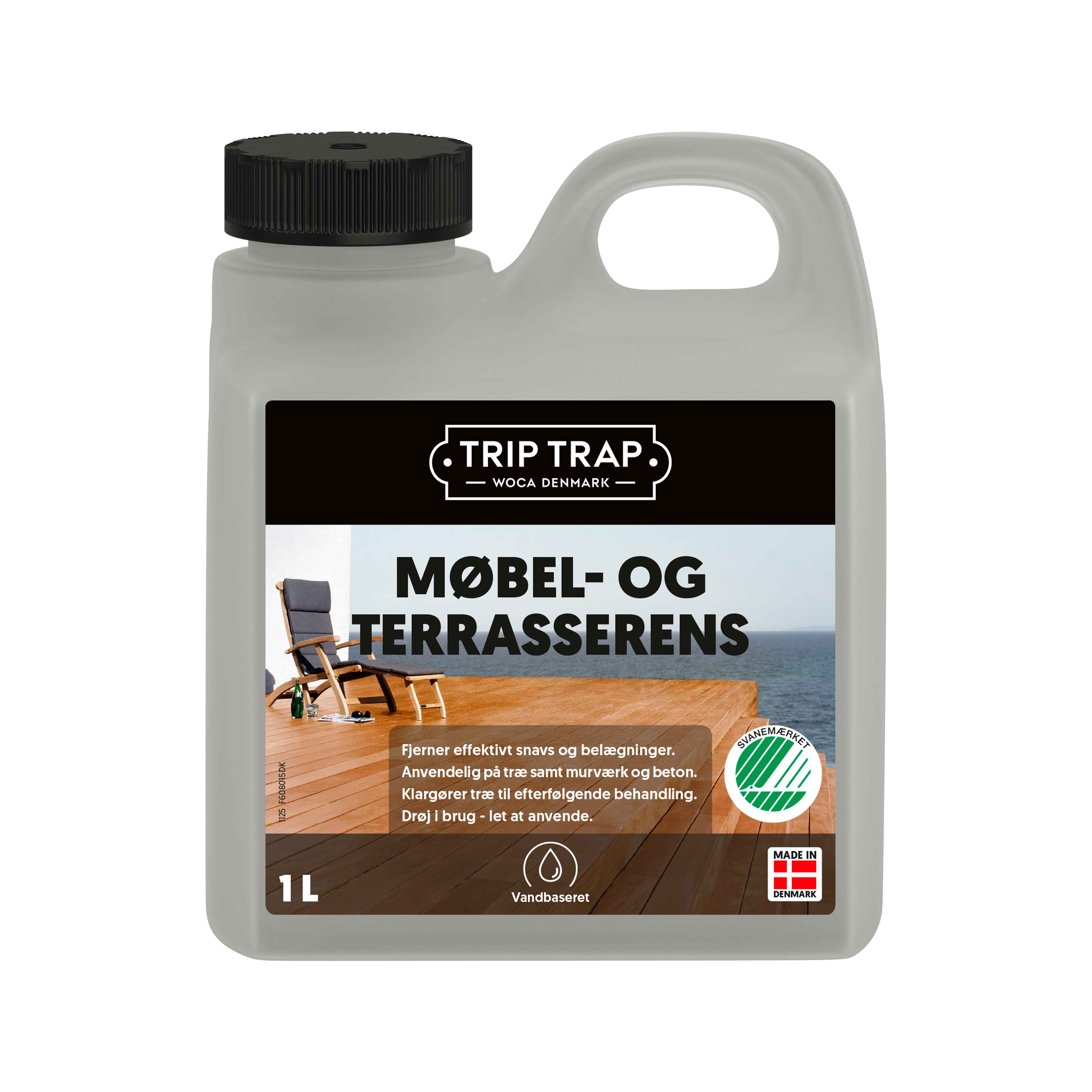 Møbel- og Terrasserens er udviklet til grundrengøring af alle former for træoverflader, som fx terrasser, havemøbler, hegn, udhæng, døre og vinduer. Produktet opløser hurtigt og effektivt snavs, og sikrer derved en optimal overflade for efterfølgende behandling. Møbel- og Terrasserens kan også bruges til afrensning af fliser, murværk og belægningssten.