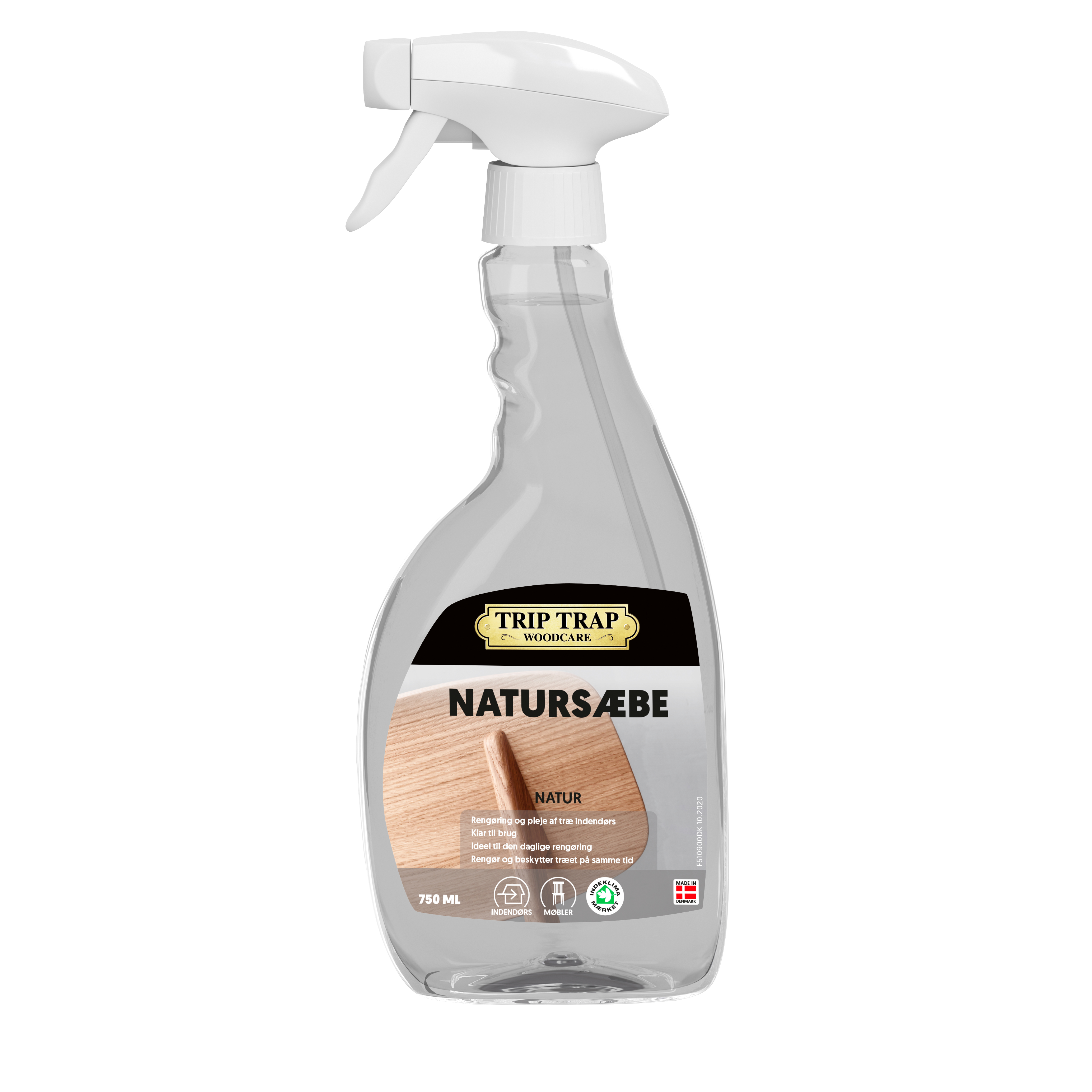Trip Trap Natursæbe er en specielt udviklet kvalitetssæbe, der er klar til brug. Sæben trænger ind i træet og lukker hurtigt træets porer. Sæben giver beskyttelse mod snavs og indtrængning af væsker. Natursæbe anvendes til rengøring og vedligeholdelse af sæbebehandlet og olierede trægulve og andre træoverflader som trapper, møbler m.v. – dog ikke til lakerede gulve, her anbefaler vi vores Laksæbe. Natural Soap er indeklimamærket og indeholder ingen parfume og konserveringsmidler.