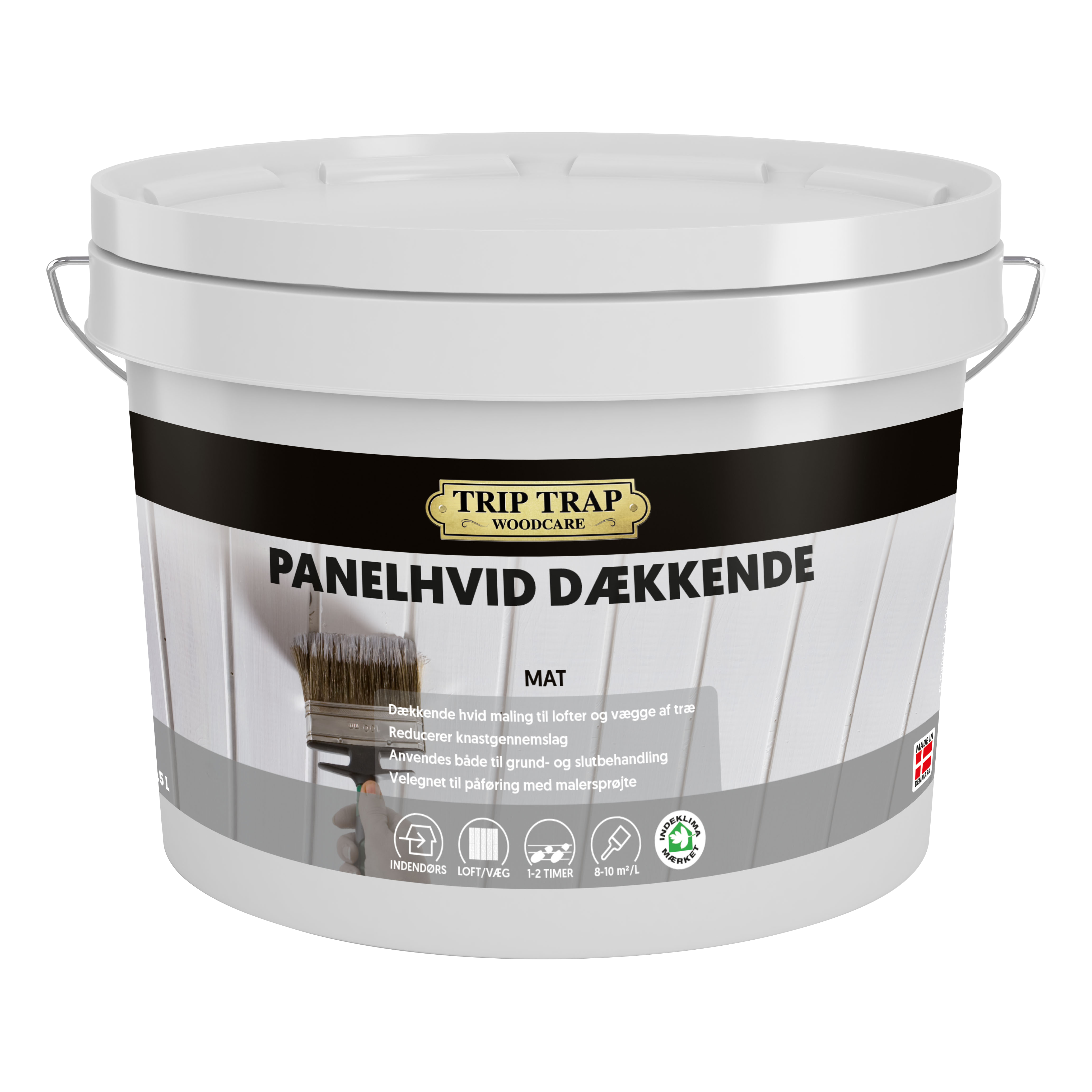 Trip Trap Panelhvid Dækkende er en helmat specialmaling, der anvendes til gulnet træværk, træprofilbrædder samt loft- og vægpaneler indendørs. Panelhvid Dækkende kan anvendes på ubehandlede eller tidligere lakerede overflader og giver træet et ultramat blødt udseende. Panelhvid Dækkende er et vandbaseret, indeklimamærket produkt, som forebygger gulning af nyt træværk og reducerer muligheden for knastgennemslag.