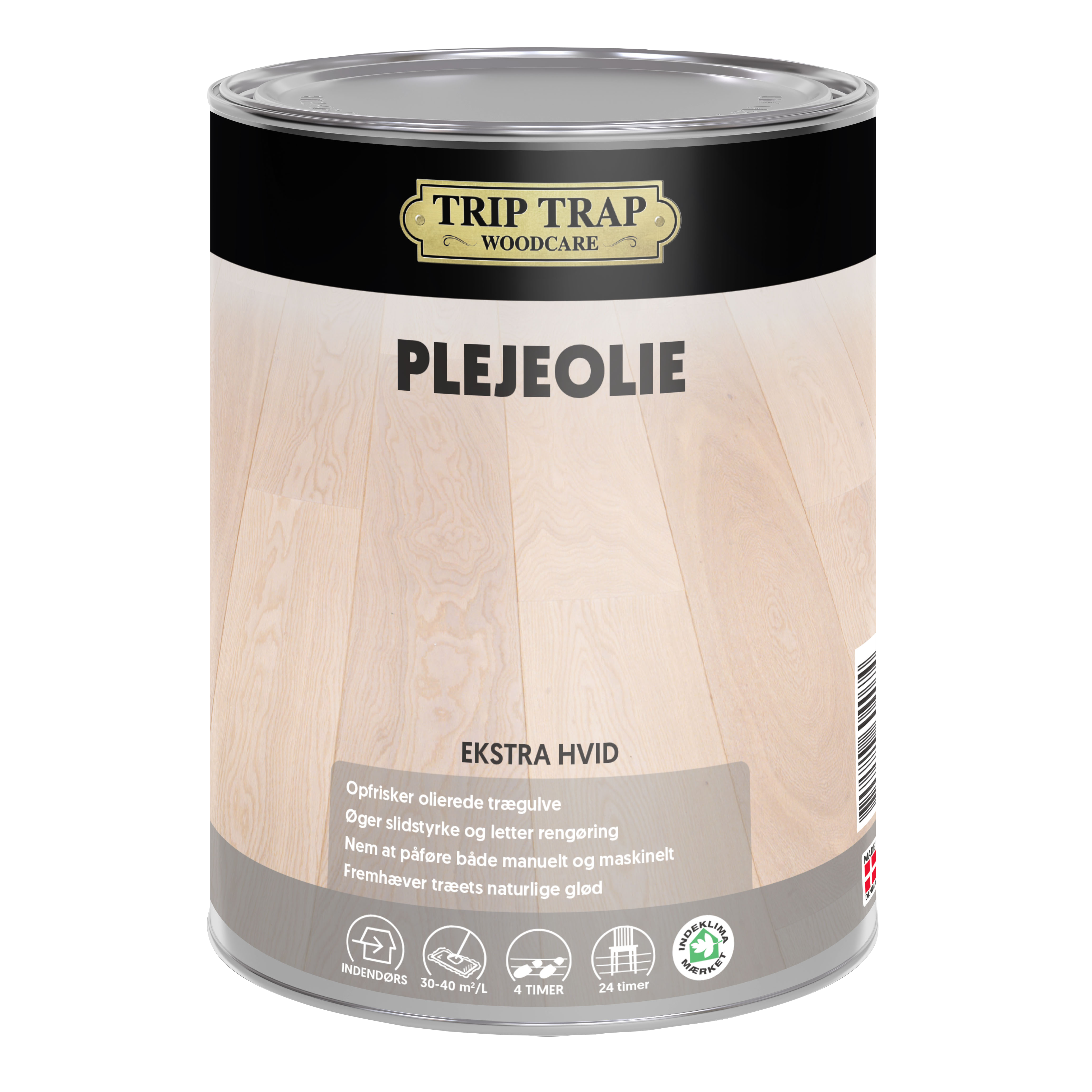 Vask gulvet med Trip Trap Trærens, 250 ml Trærens blandes med 5 L varmt vand. Vask efter med rent vand. Lad herefter gulvet tørre i mindst 8 timer, til det er helt tørt.