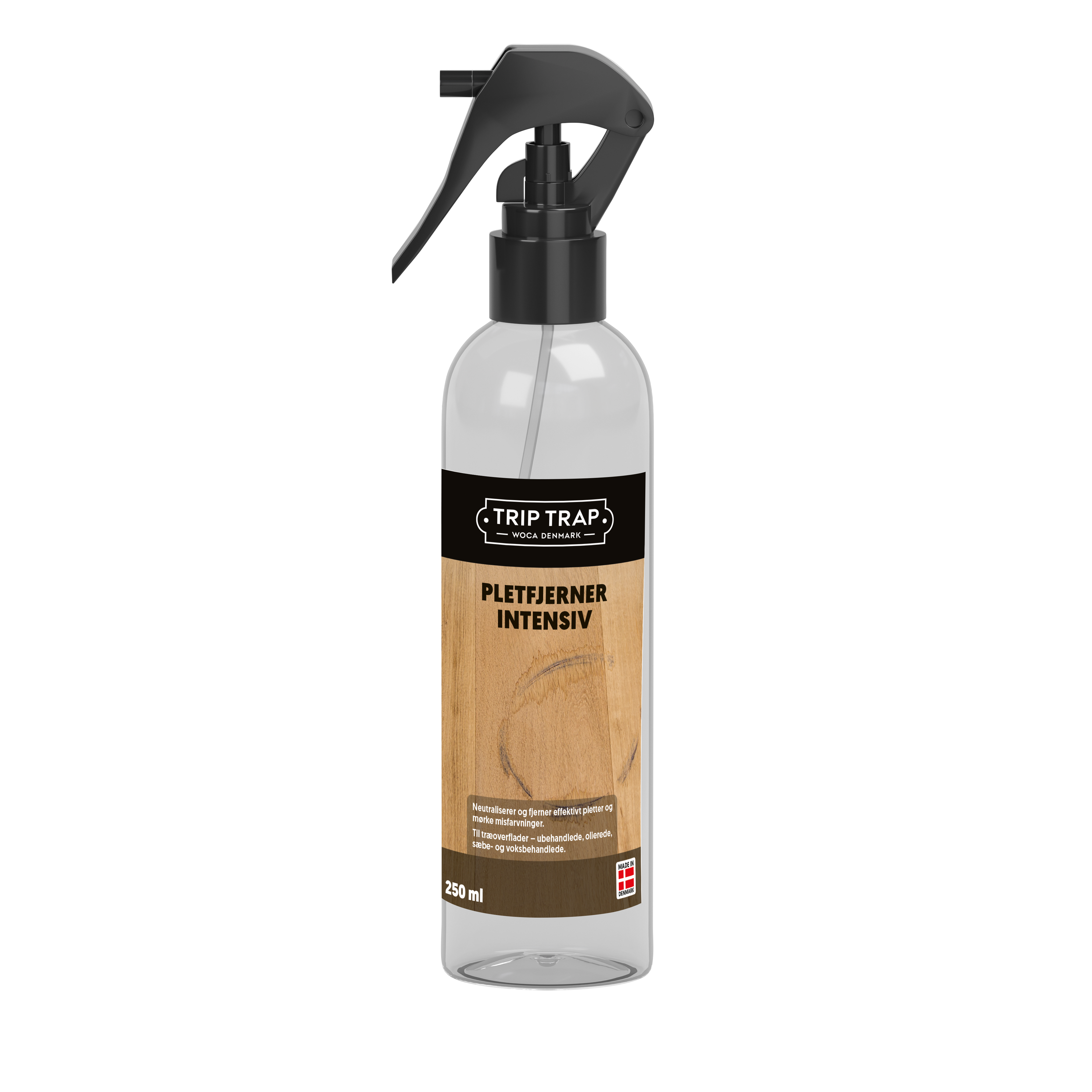 Trip Trap Pletfjerner intensiv neutraliserer og opløser effektivt sorte mærker forårsaget af vand og garvesyre. Produktet kan anvendes på ubehandlede, sæbebehandlede, olierede, og voksbehandlede overflader. Anvendes på træ som indeholder store mængder garvesyre så som egetræ.