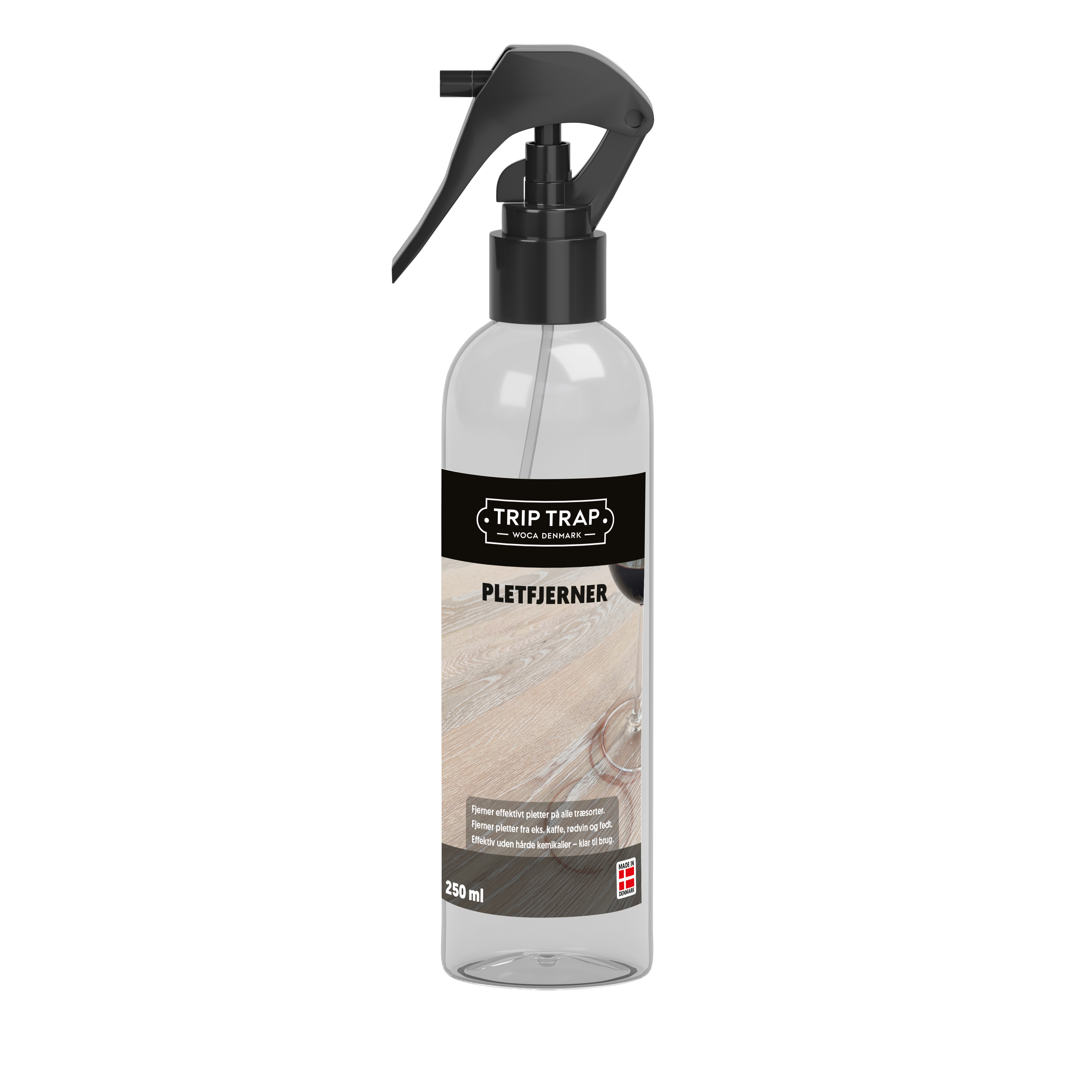 Trip Trap Pletfjerner til træ er specielt udviklet til effektiv fjernelse af pletter på alle typer træ. Det sæbebaserede produkt er ideelt til olierede træoverflader og fjerner nemt pletter fra f.eks. fedt, olie, blod, kaffe, te og rødvin.
