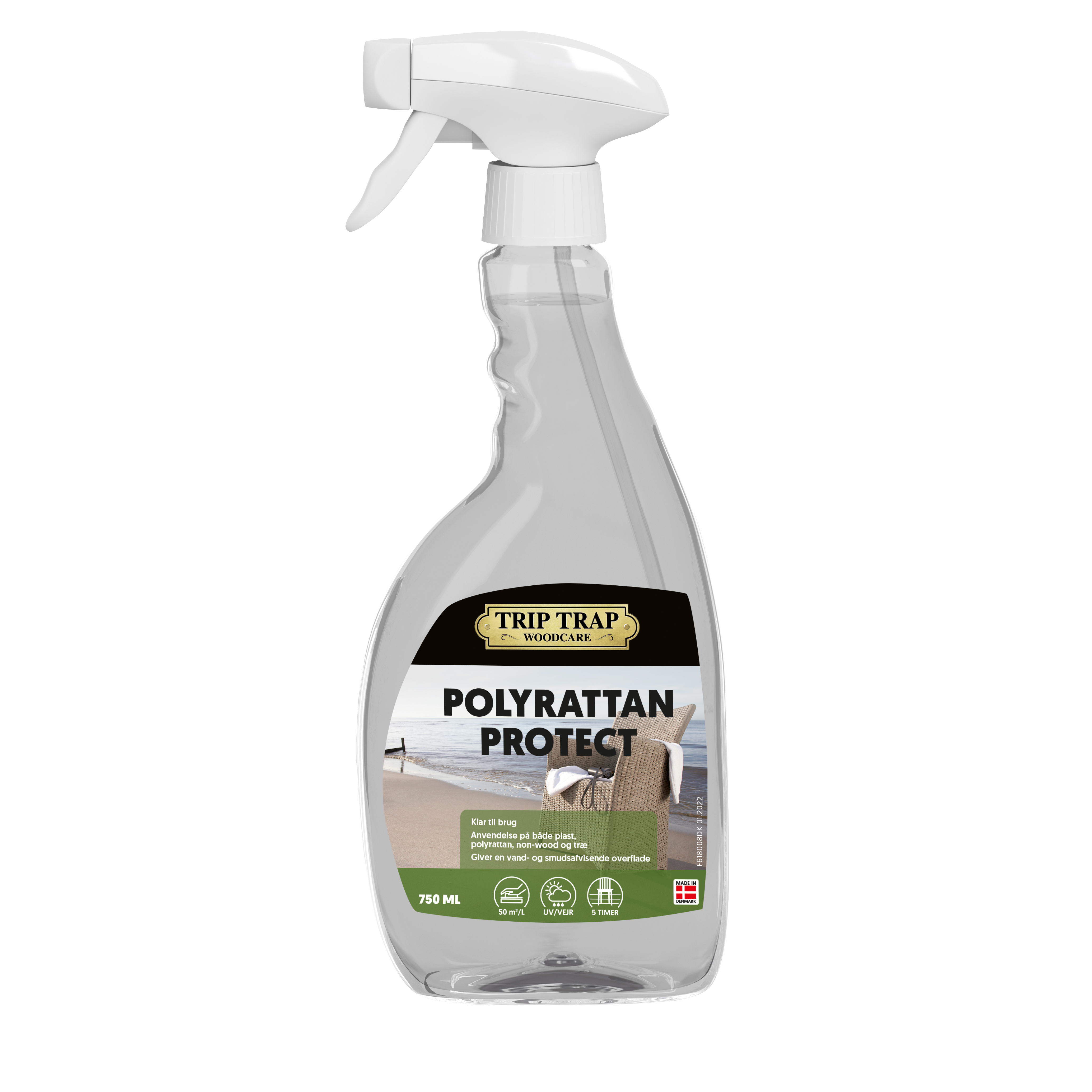 Trip Trap Polyrattan Protect anvendes til beskyttelse af non-wood, plast- og polyrattan havemøbler og hegn. Behandlingen giver møblerne en vandskyende og smuds-, olie- og fedtafvisende overflade. Behandlingen gentages efter behov. Produktet kan ligeledes anvendes til havemøbler af træ. Inden behandling med Polyrattan Protect bør overfladen renses med Trip Trap Polyrattan Rens.