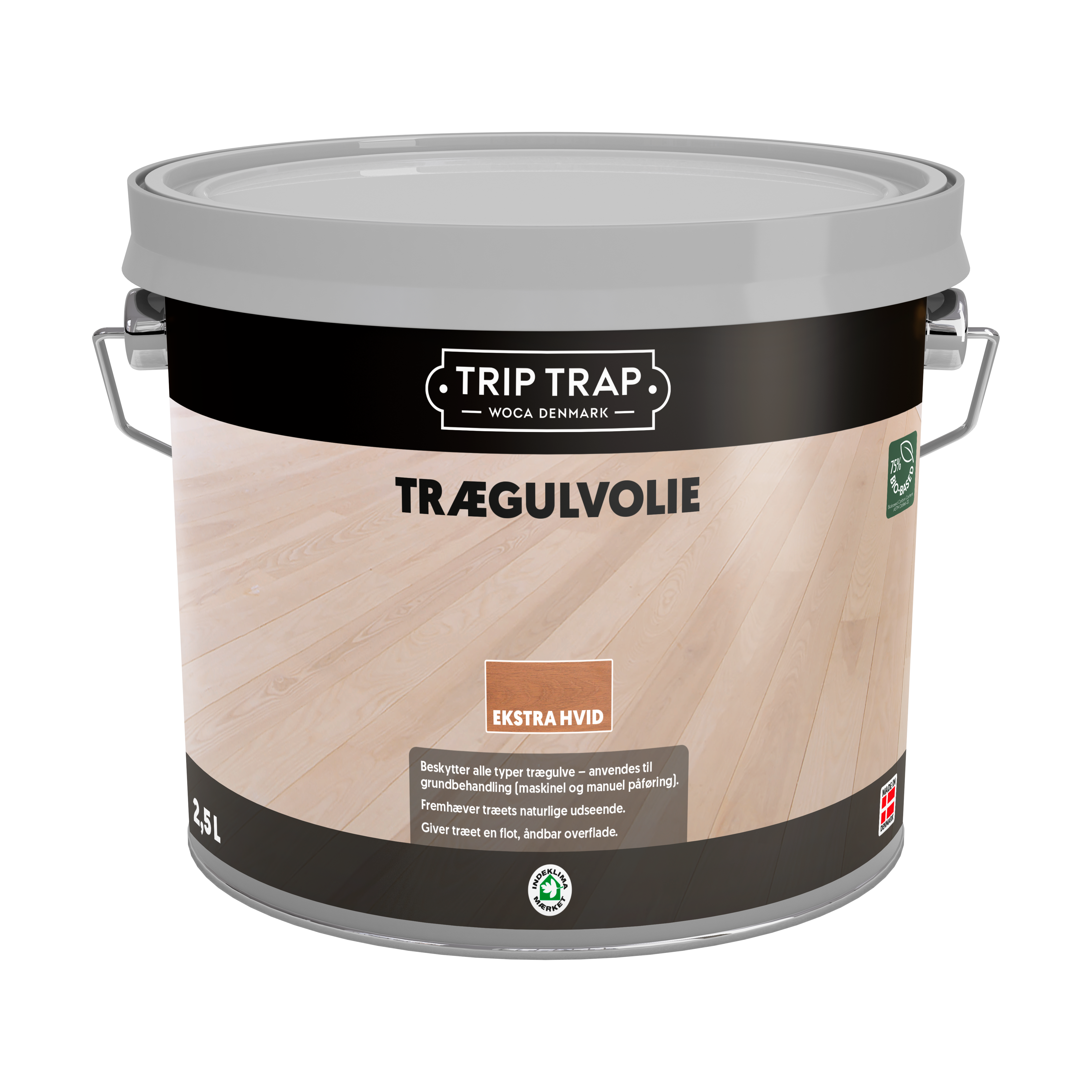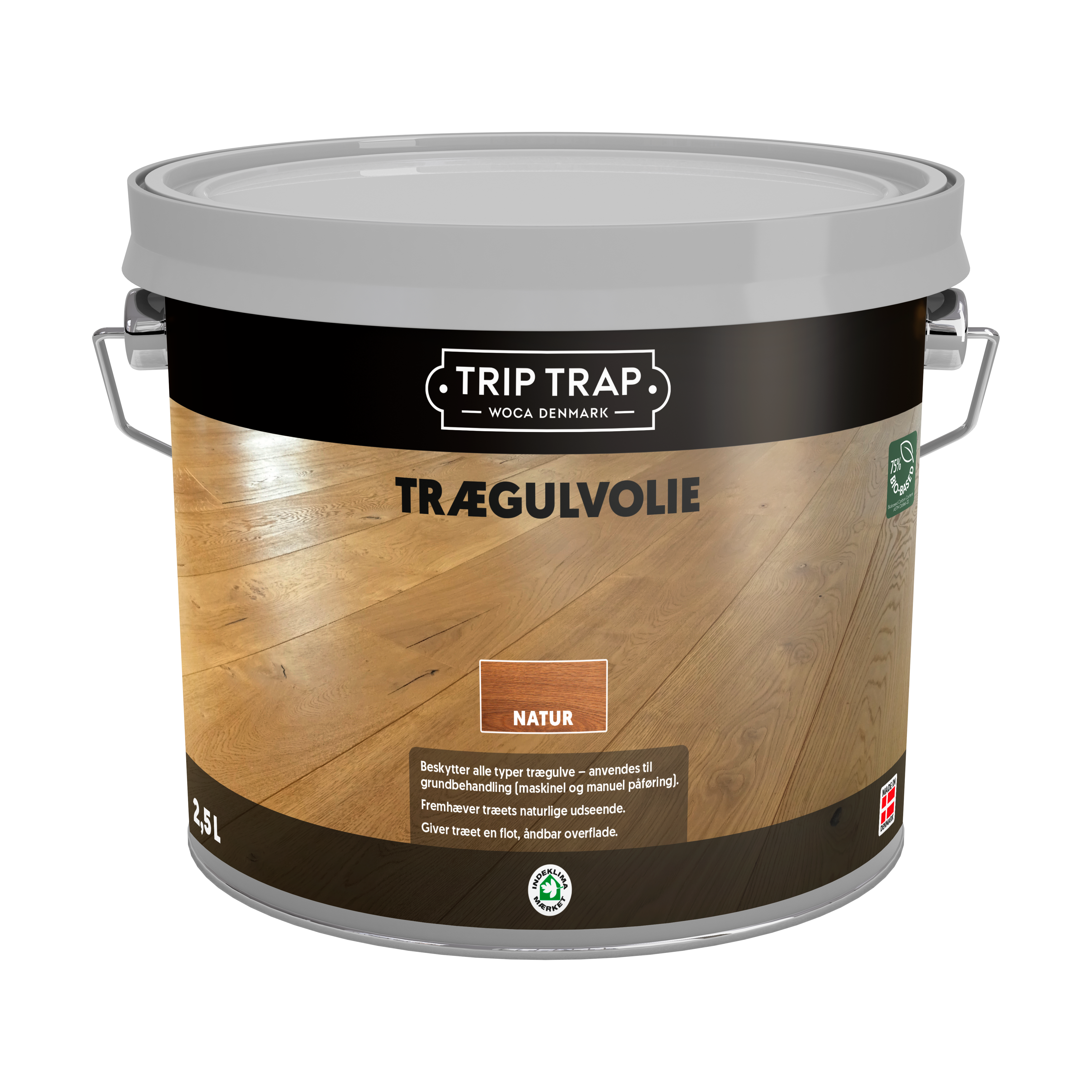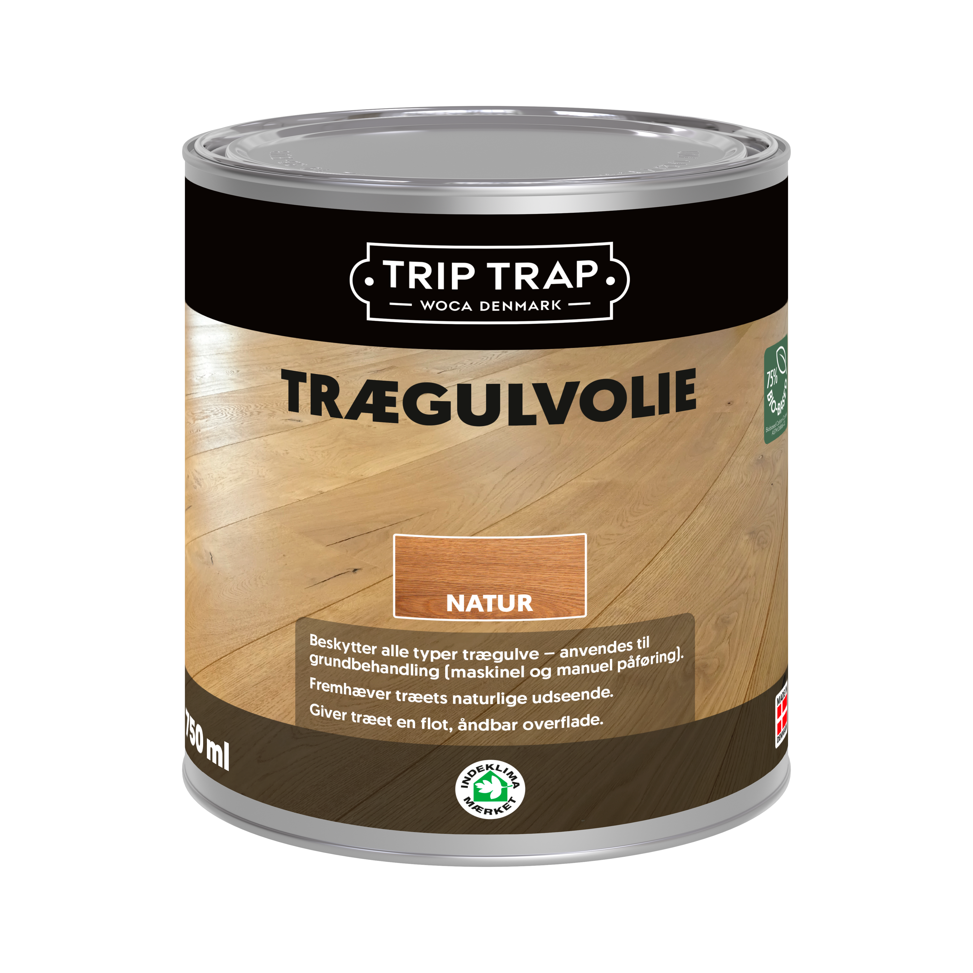 Trip Trap Trægulvolie Natur og Ekstra Hvid anvendes til grundoliering af alle ubehandlede, ludbehandlede, afslebne eller nye trægulve (indendørs). Natur anvendes til mørke gulve som merbau, teak, mahogni, kirsebær, keruing m.fl. Ekstra hvid anvendes til nåletræsgulve samt lyse hårdttræsgulve som bøg, eg, ask, hevea m.fl. Oliebehandlingen kan foretages både manuelt og maskinelt. Maskinel oliebehandling anbefales ved gulvflader over 15 m².