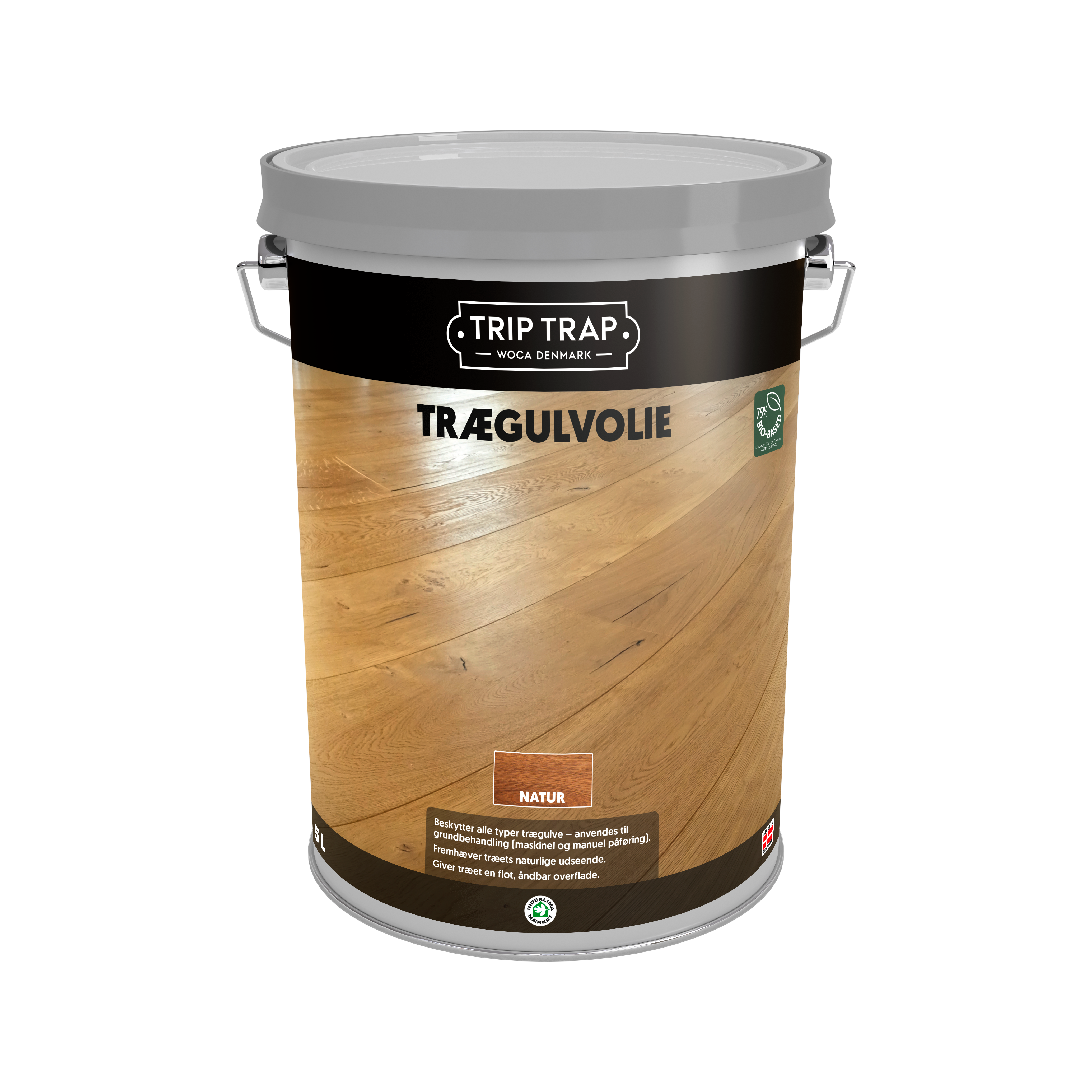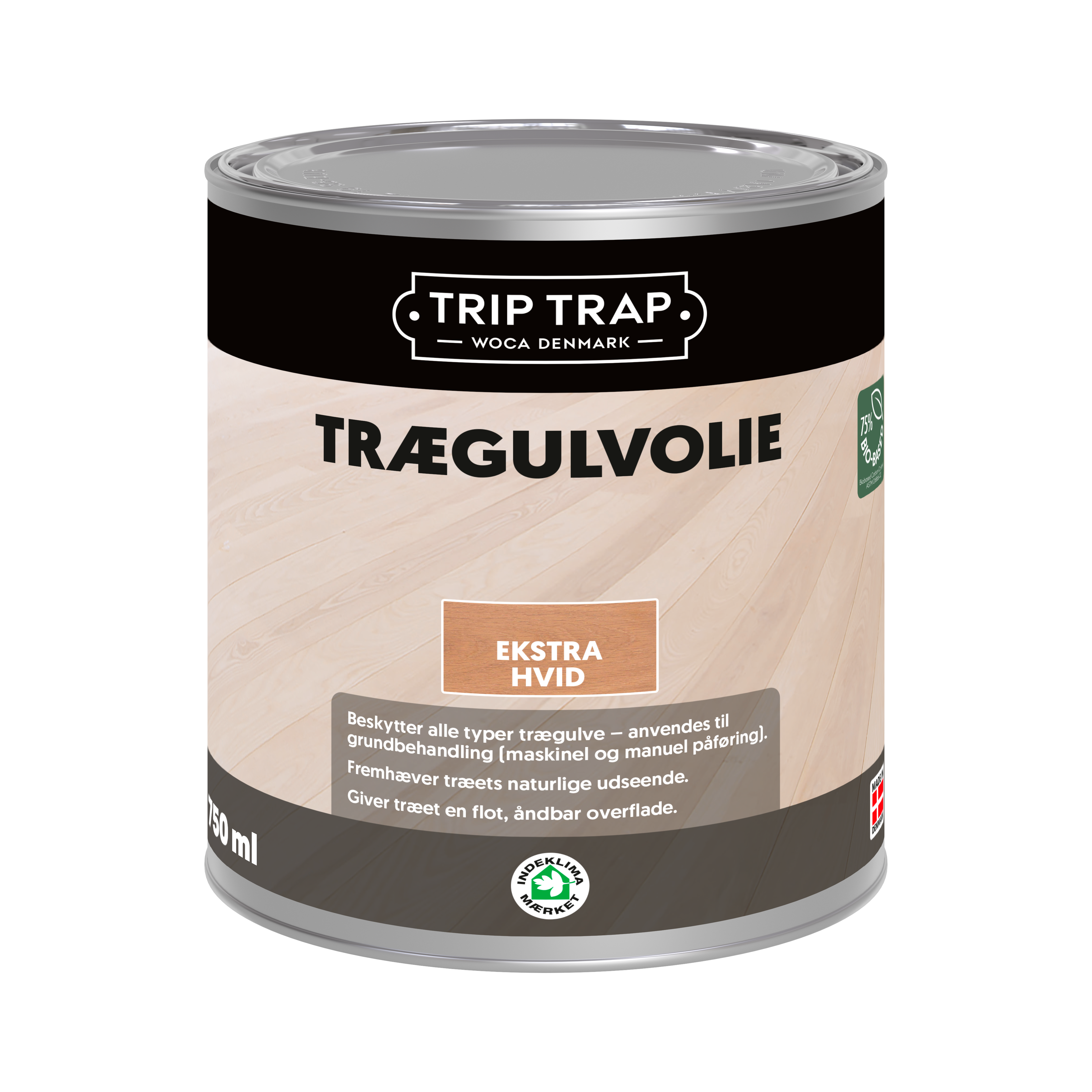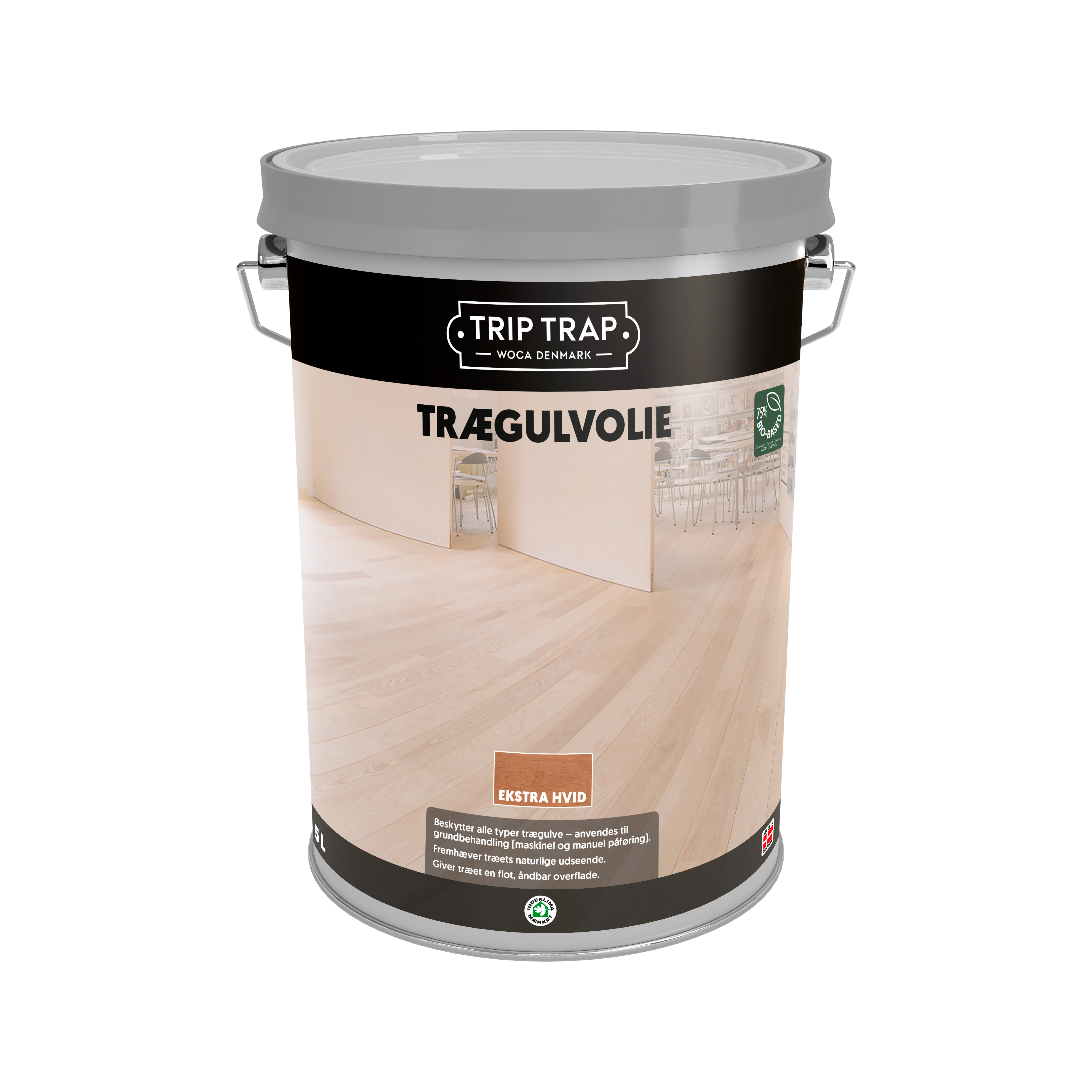 Trip Trap Trægulvolie Natur og Ekstra Hvid anvendes til grundoliering af alle ubehandlede, ludbehandlede, afslebne eller nye trægulve (indendørs). Natur anvendes til mørke gulve som merbau, teak, mahogni, kirsebær, keruing m.fl. Ekstra hvid anvendes til nåletræsgulve samt lyse hårdttræsgulve som bøg, eg, ask, hevea m.fl. Oliebehandlingen kan foretages både manuelt og maskinelt. Maskinel oliebehandling anbefales ved gulvflader over 15 m².